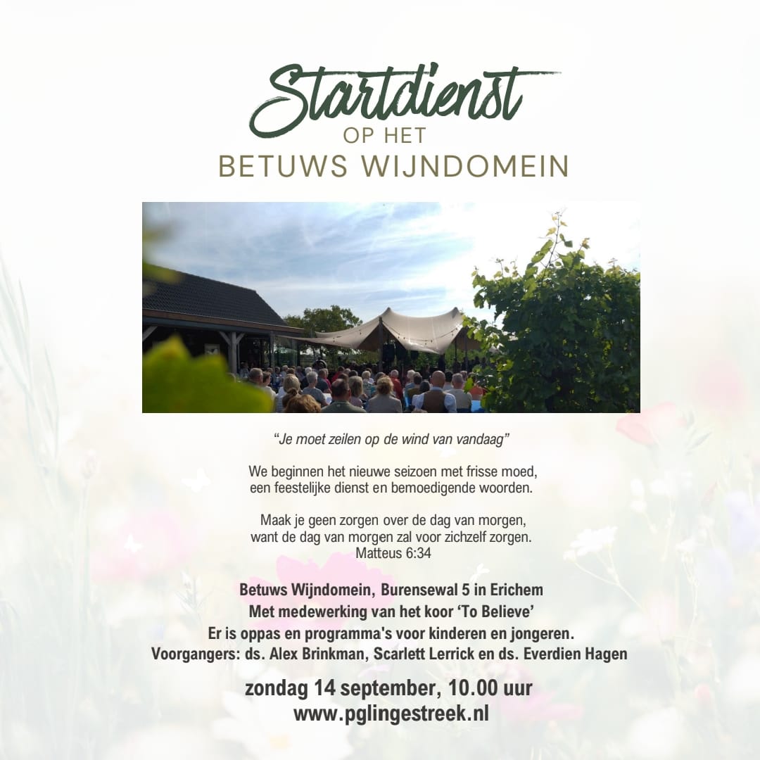 Openluchtdienst in Betuws Wijndomein 3 september Op zondag 3 september houdt de Protestantse Gemeente Lingestreek haar eerste Startzondag. Een bijzonder moment. Deze openluchtdienst begint om 10.00 uur. Het thema is: ‘Je hoort erbij! Doe je mee?’. Het gospelkoor To Believe, onder leiding van Jaap Bron, verleent zijn medewerking. Voorganger is ds. Everdien Hagen. Er is oppas en kindernevendienst. Met dank aan Ardo Schelling Klik hier onder verder voor een aantal foto's van de Dienst | ||