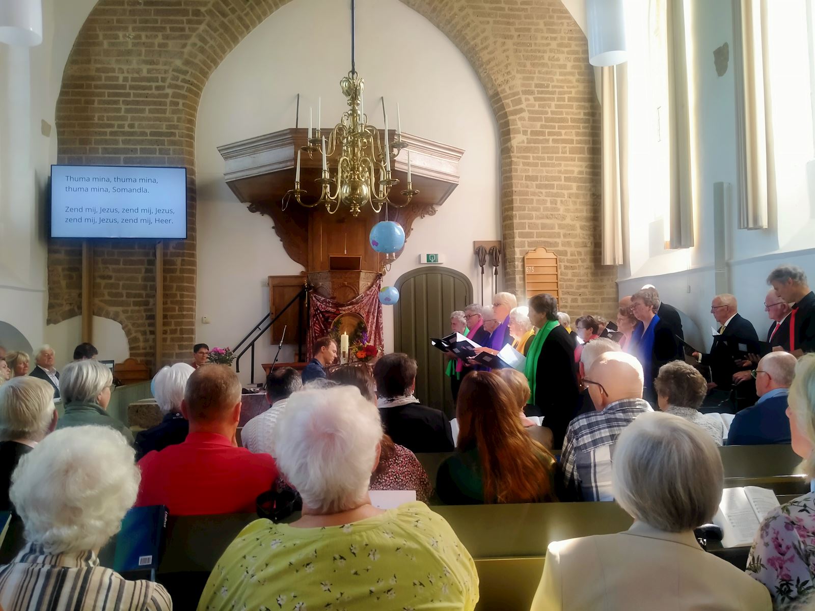 ![]() Vlak voor de dienst worden er in het hele gebouw stoelen gezocht en gelukkig gevonden, sommige mensen zitten in de nissen. Het is Pinksteren: de kerk van Erichem Was tot de laatste stoel bezet. Geloven Wereldwijd Dichtbij is het thema, zichtbaar aan de wereldbollen in de kerk. | ||